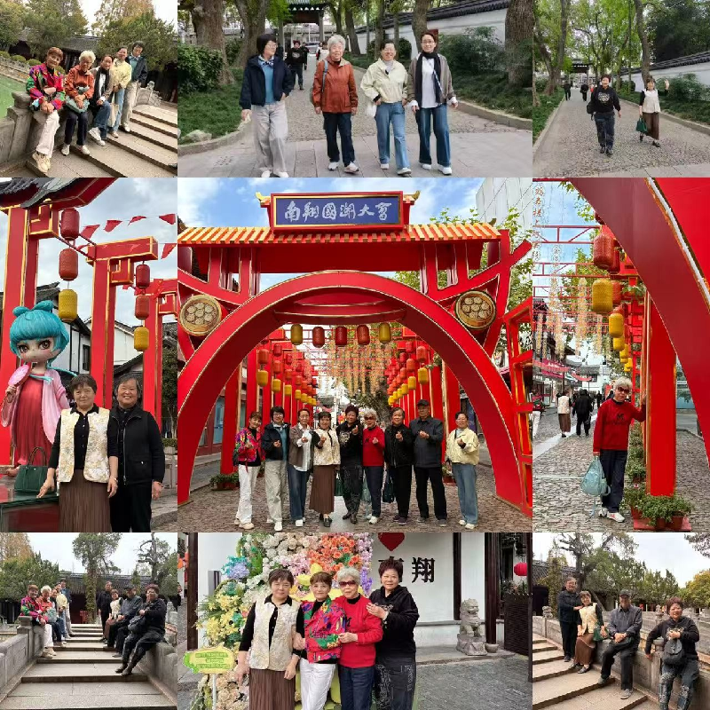 午后,老师们前往南翔古镇,开启悠闲的古镇漫游时光。青石板路蜿蜒曲折,两旁白墙黛瓦的民居错落有致,小桥流水萦绕其间,尽显江南水乡的温婉韵味。大家三五成群,漫步在古镇街巷,时而驻足欣赏古朴的建筑风貌,时而被街边的特色小吃、手工艺品吸引;有的老师在古桥边合影留念,定格美好瞬间;有的则坐在河畔长椅上,畅谈昔日在幼儿园共事的难忘岁月,分享如今的退休生活趣事,欢声笑语回荡在古镇的每个角落。此外,老师们还打卡了古镇标志性景点,近距离感受千年古镇的历史积淀与生活气息。